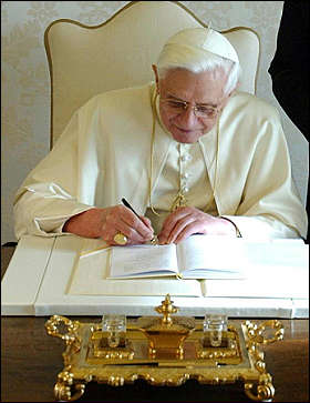Per questo, ben consapevole della gravità di questo atto, con piena libertà, dichiaro di rinunciare al ministero di Vescovo di Roma, Successore di San Pietro, a me affidato per mano dei Cardinali il 19 aprile 2005, in modo che, dal 28 febbraio 2013, alle ore 20,00, la sede di Roma, la sede di San Pietro, sarà vacante e dovrà essere convocato, da coloro a cui compete, il Conclave per l’elezione del nuovo Sommo Pontefice.